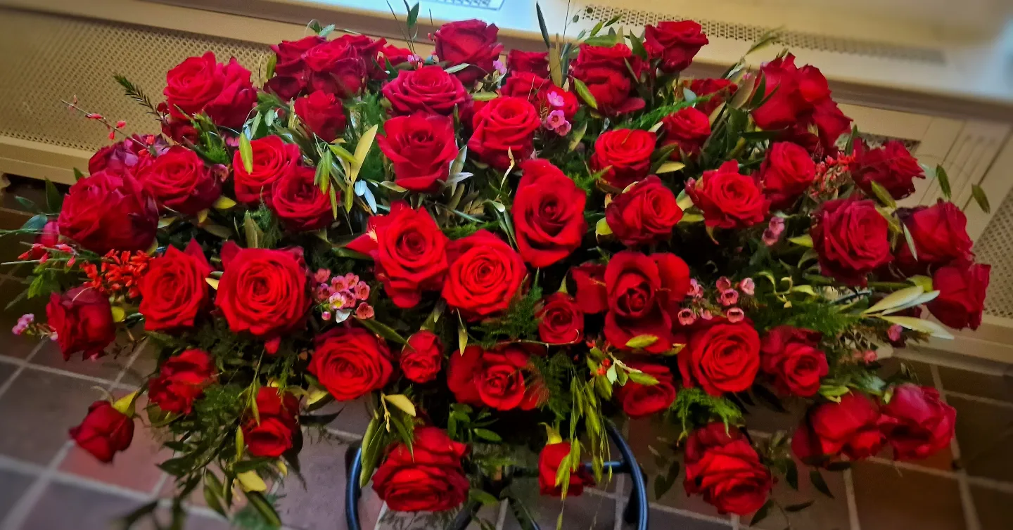 Een prachtig warm bloemstuk met rode rozen en groen.